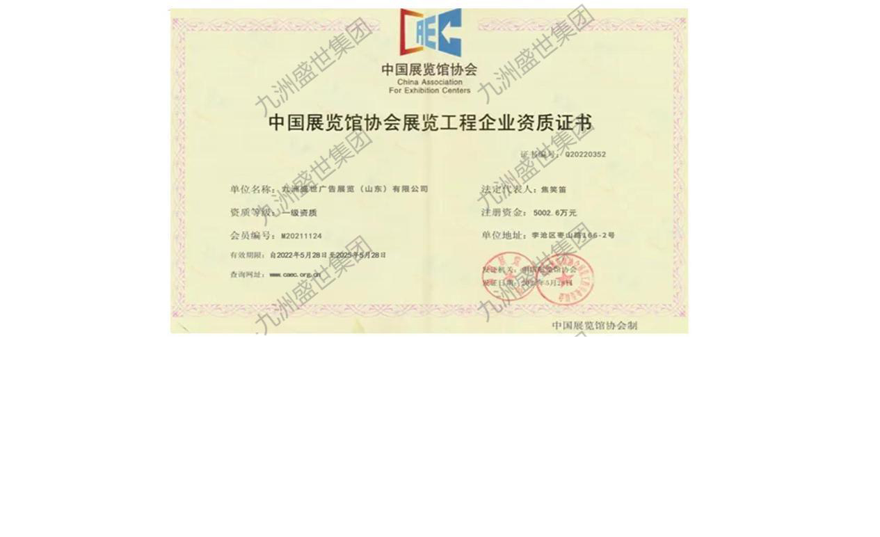 中國展覽館協會展覽工程企業一級資質證書